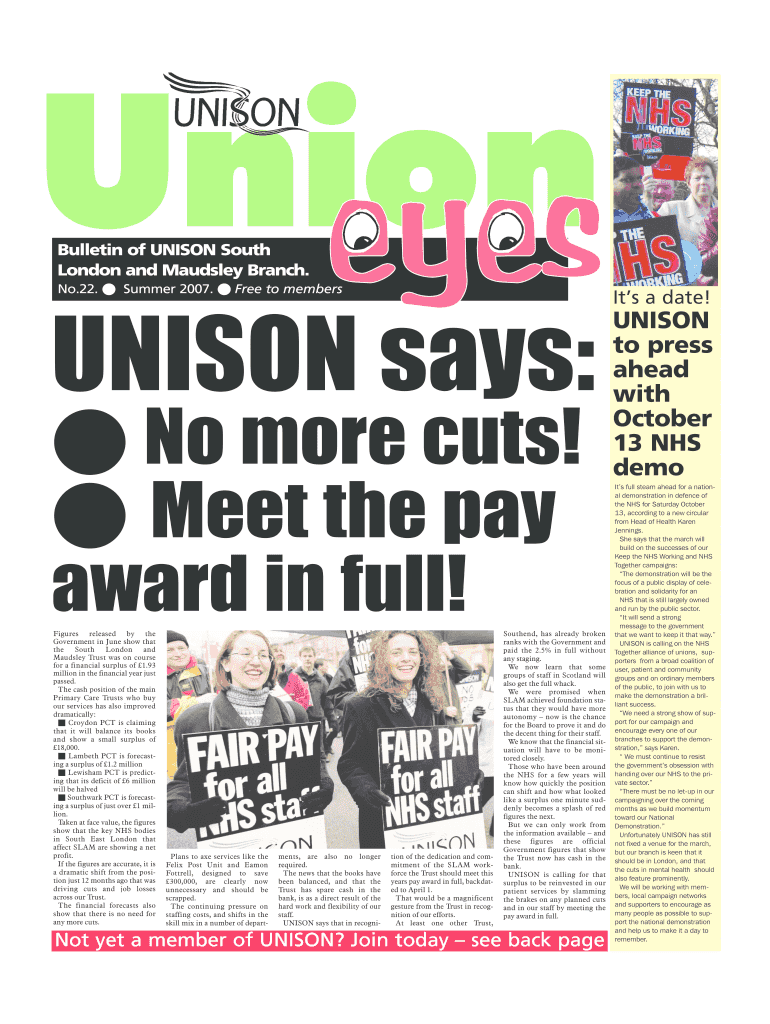 Bulletin of UNISON South London and Mandela Branch. No.22. ! Summer 2007. ! Free to members UNISON says: ! No more cuts! ! Meet the pay award in full! Figures released by the Government in June show