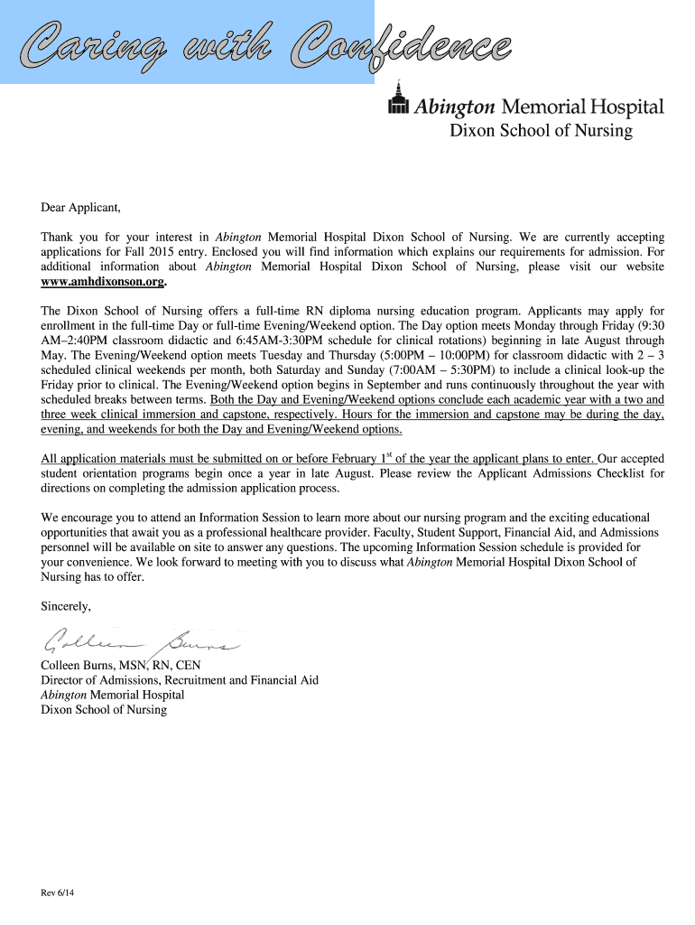 Dixon School of Nursing Dear Applicant, Thank you for your interest in Abington Memorial Hospital Dixon School of Nursing. We are currently accepting applications for Fall 2015 entry. Enclosed you