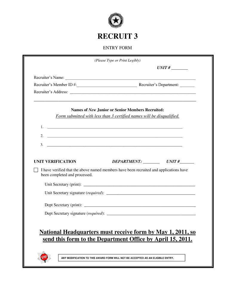 RECRUIT 3 ENTRY FORM (Please Type or Print Legibly) UNIT # Recruiters Name: Recruiters Member ID #: Recruiters Department: Recruiters Address: Names of New Junior or Senior Members Recruited: Form