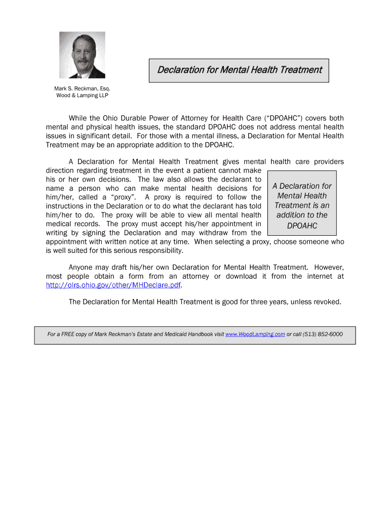 Declaration for Mental Health Treatment Mark S. Beckman, Esq. Wood & Camping While the Ohio Durable Power of Attorney for Health Care (DPO AHC) covers both mental and physical health issues, the standard