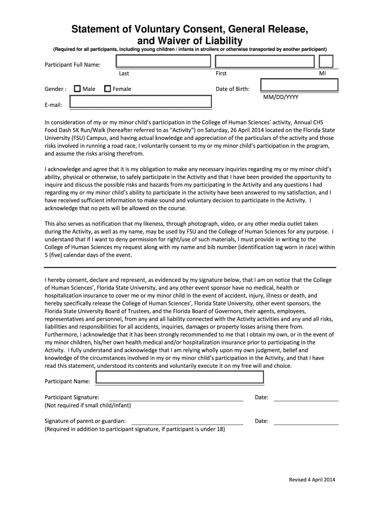 Statement of Voluntary Consent, General Release, and Waiver of Liability (Required for all participants, including young children / infants in strollers or otherwise transported by another participant)