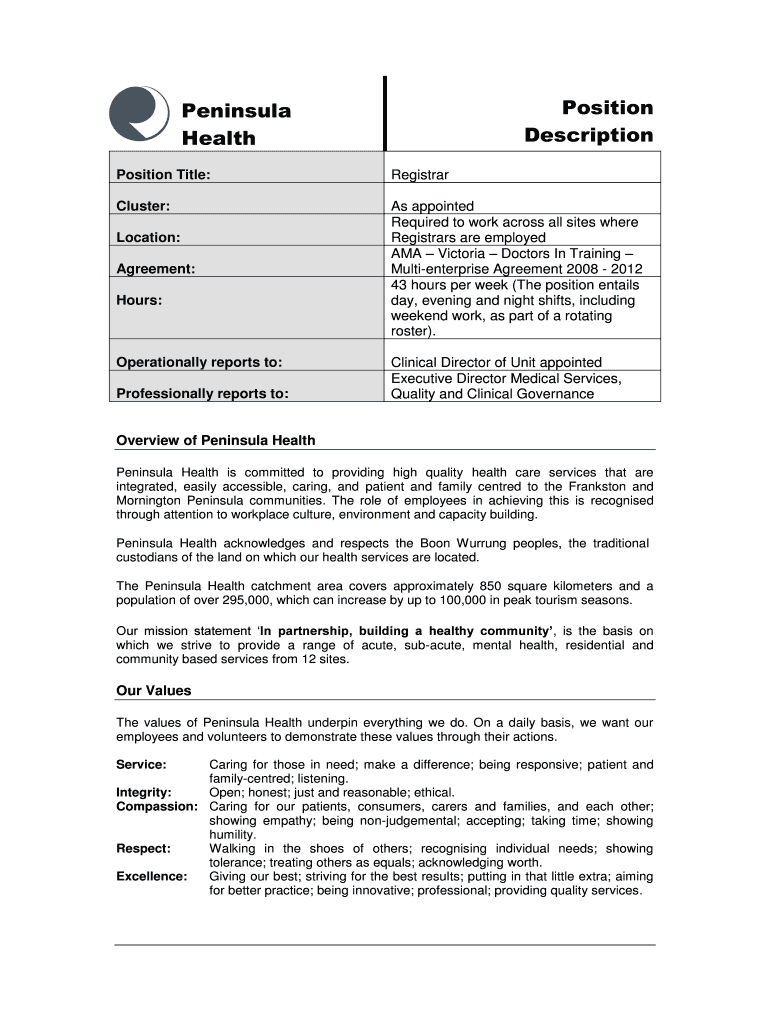 Position DescriptionPeninsula Health Position Title:RegistrarCluster:As appointed Required to work across all sites where Registrars are employed AMA Victoria Doctors In Training Multi enterprise