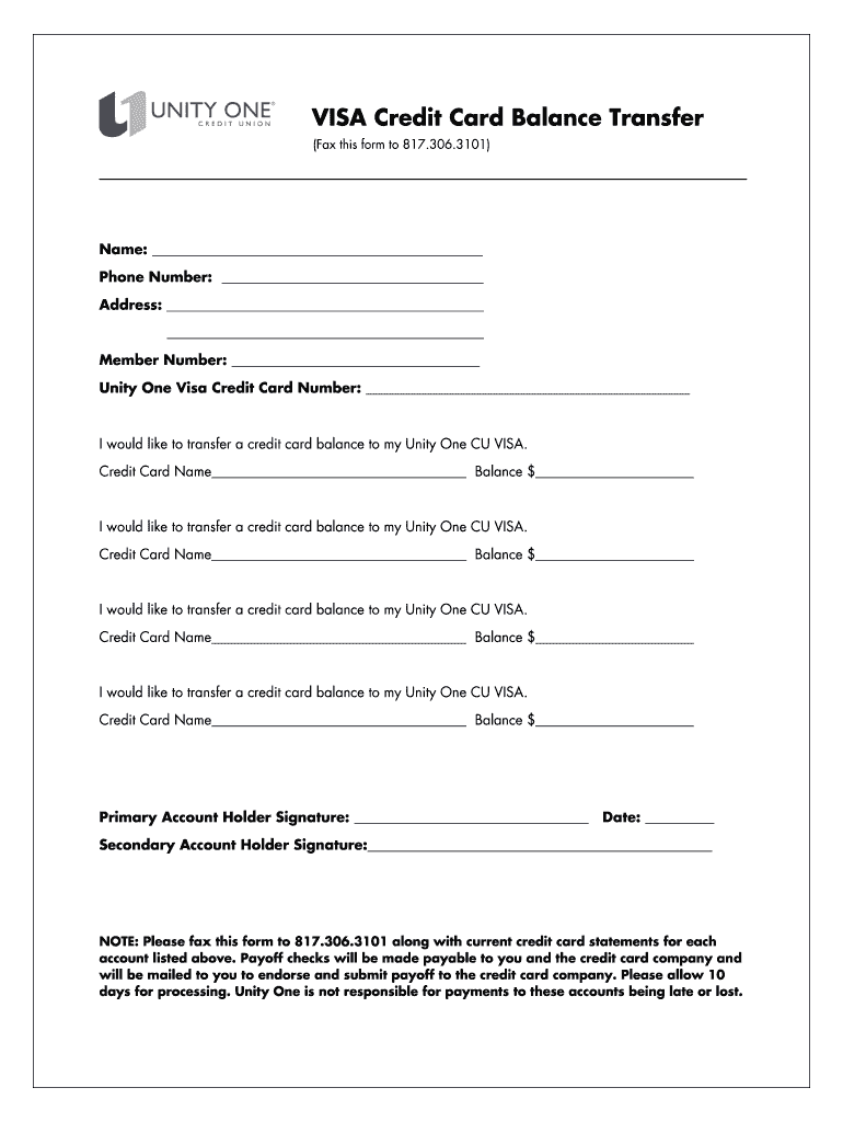 VISA Credit Card Balance Transfer (Fax this form to 817.306.3101) Name: Phone Number: Address: Member Number: Unity One Visa Credit Card Number: I would like to transfer a credit card balance to my