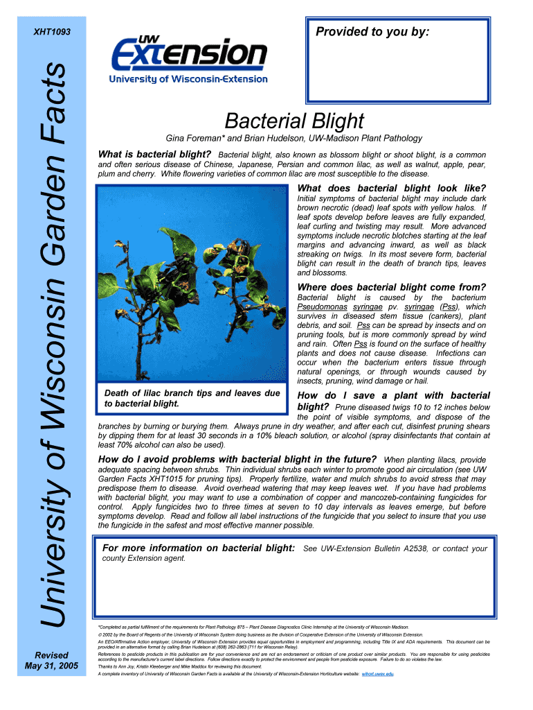 Provided to you by: University of Wisconsin Garden Facts XHT1093 Bacterial Blight Gina Foreman* and Brian Hudson, Madison Plant Pathology What is bacterial blight? Bacterial blight, also known as