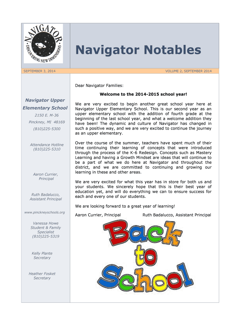 Navigator Notables SEPTEMBER 3, 2014, VOLUME 2, SEPTEMBER 2014 Dear Navigator Families: Welcome to the 20142015 school year! Navigator Upper Elementary School 2150 E. M36 Pinckney, MI 48169 (810)2255300