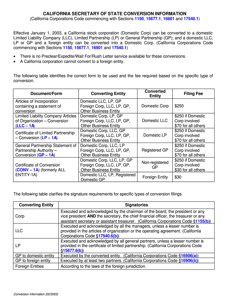 Yes, there are fees associated with filing the conversion form. Verify the current fee structure on the California Secretary of State's website or consult a legal advisor for specifics.