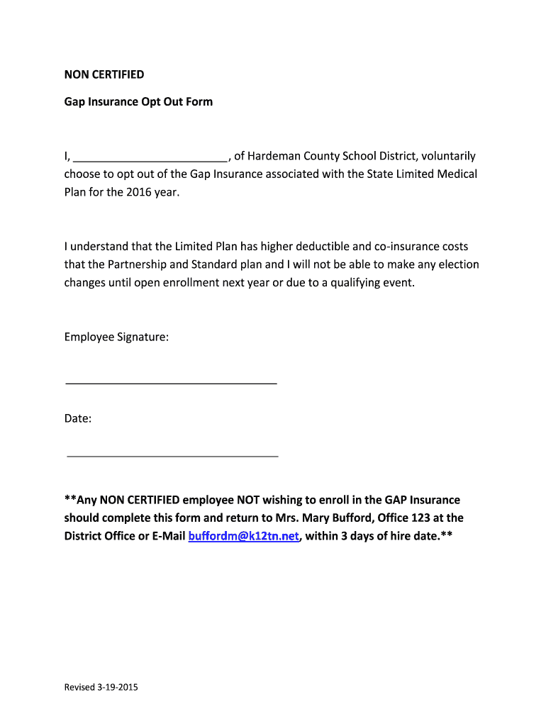 NON CERTIFIED Gap Insurance Opt-Out Form I, of Hartman County School District, voluntarily choose to opt out of the Gap Insurance associated with the State Limited Medical Plan for the 2016 year.