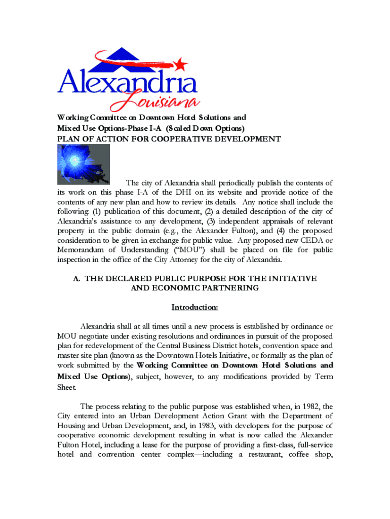 The Working Committee on Downtown Hotel Solutions and Mixed Use Options-Phase I-A is a collaborative initiative aimed at developing strategic recommendations for hotel solutions and mixed-use developments in downtown areas. The PLAN OF ACTION focuses on scaled-down options to promote feasible and sustainable development.