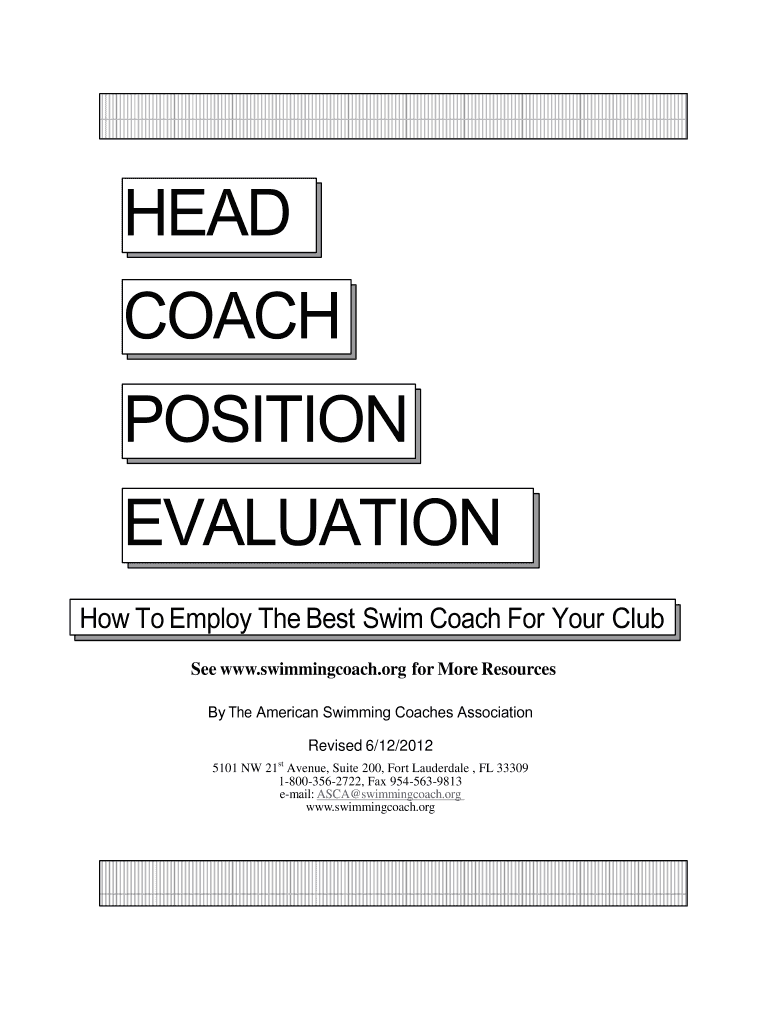 HEAD COACH POSITION EVALUATION How To Employ The Best Swim Coach For Your Club See www.swimmingcoach.org for More Resources By The American Swimming Coaches Association Revised 6/12/2012 st5101 NW