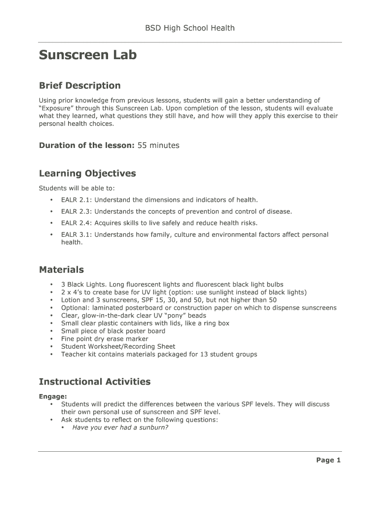 BSD High School Health Sunscreen Lab Brief Description Using prior knowledge from previous lessons, students will gain a better understanding of Exposure through this Sunscreen Lab. Upon completion