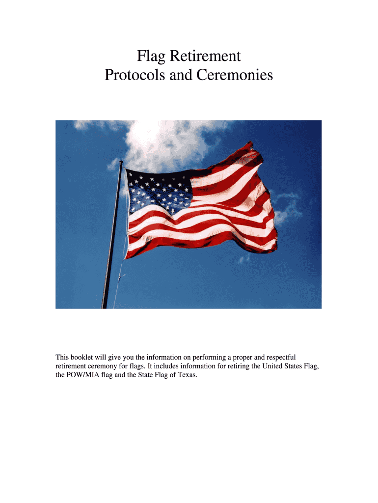 Flag Retirement Protocols and CeremoniesThis booklet will give you the information on performing a proper and respectful retirement ceremony for flags. It includes information for retiring the United