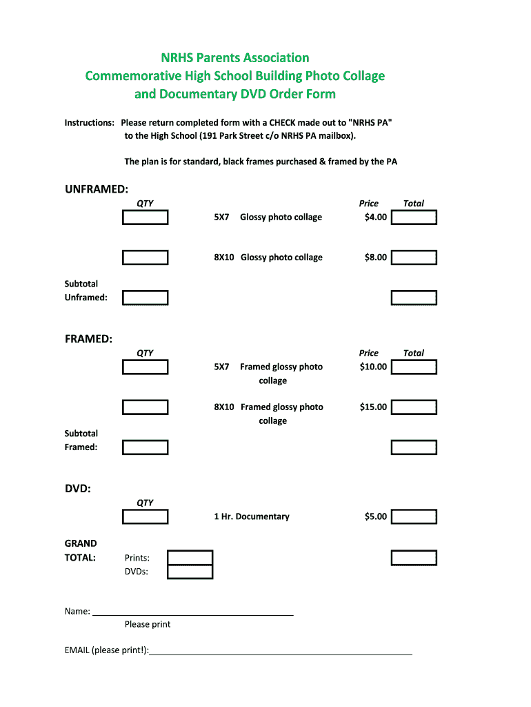 NHS Parents Association Commemorative High School Building Photo Collage and Documentary DVD Order Form Instructions: Please return completed form with a CHECK made out to NHS PA to the High School