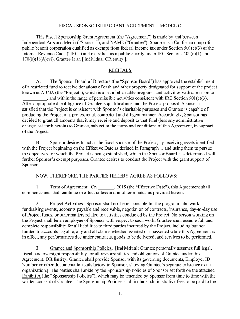 FISCAL SPONSORSHIP GRANT AGREEMENT MODEL C This Fiscal Sponsorship Grant Agreement (the Agreement) is made by and between Independent Arts and Media (Sponsor), and NAME (Grantee). Sponsor is a California