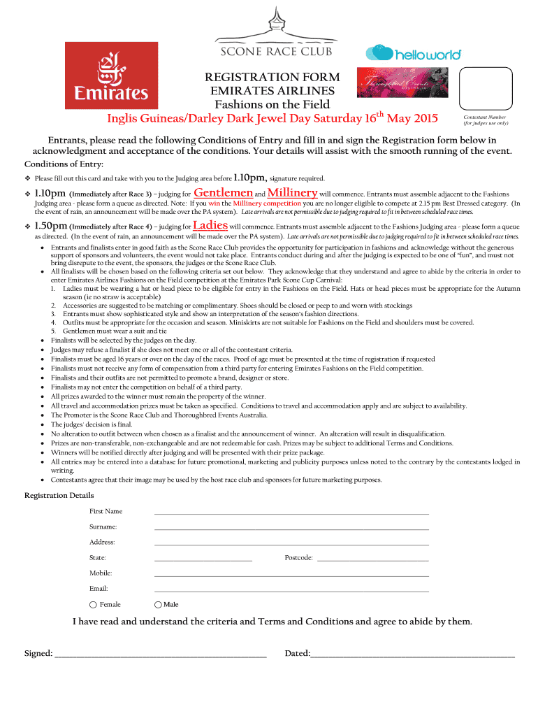 REGISTRATION FORM EMIRATES AIRLINES Fashions on the Field English Guineas/Darla Dark Jewel Day Saturday 16th May 2015 Contestant Number (for judges use only) Entrants, please read the following Conditions