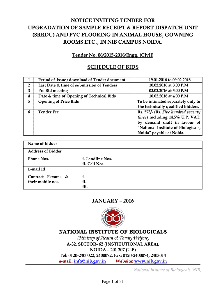 Get the free NOTICE INVITING TENDER FOR UPGRADATION OF SAMPLE RECEIPT - nib gov