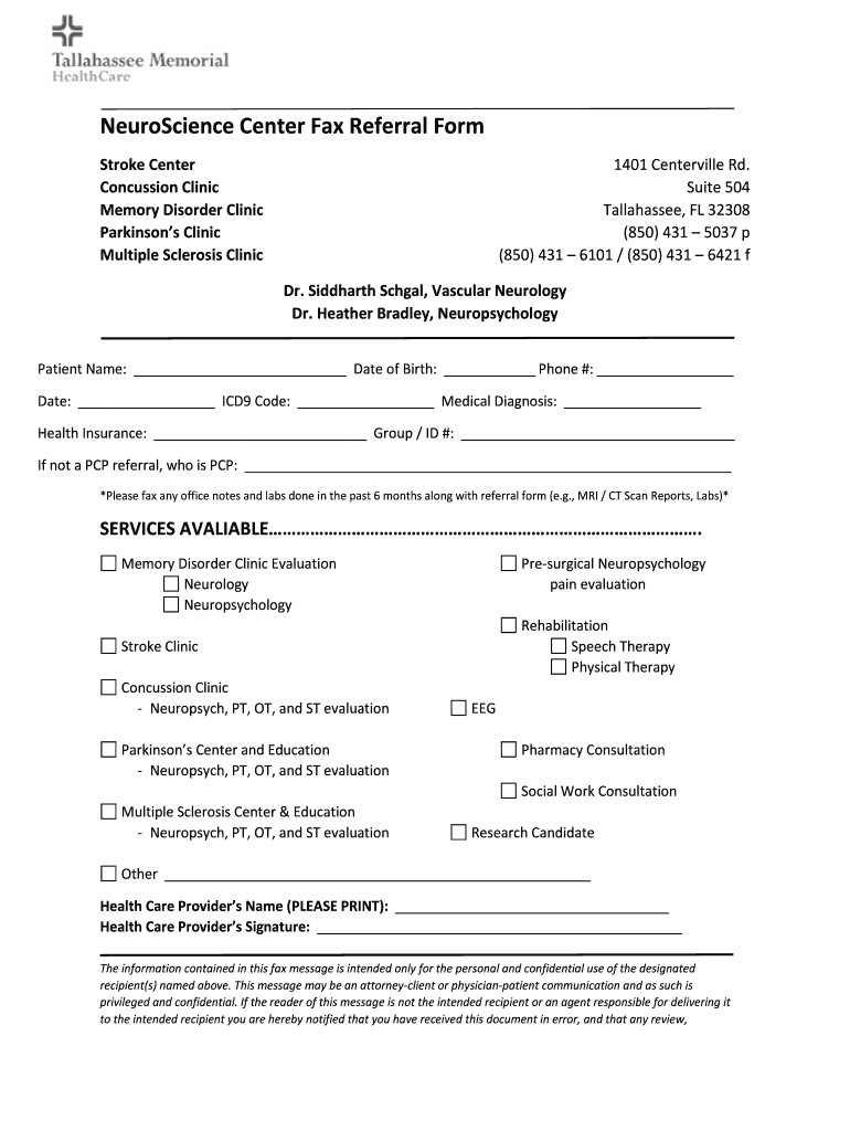 NeuroScience Center Fax Referral Form Stroke Center Concussion Clinic Memory Disorder Clinic Parkinson's Clinic Multiple Sclerosis Clinic 1401 Centerville Rd. Suite 504 Tallahassee, FL 32308 (850)