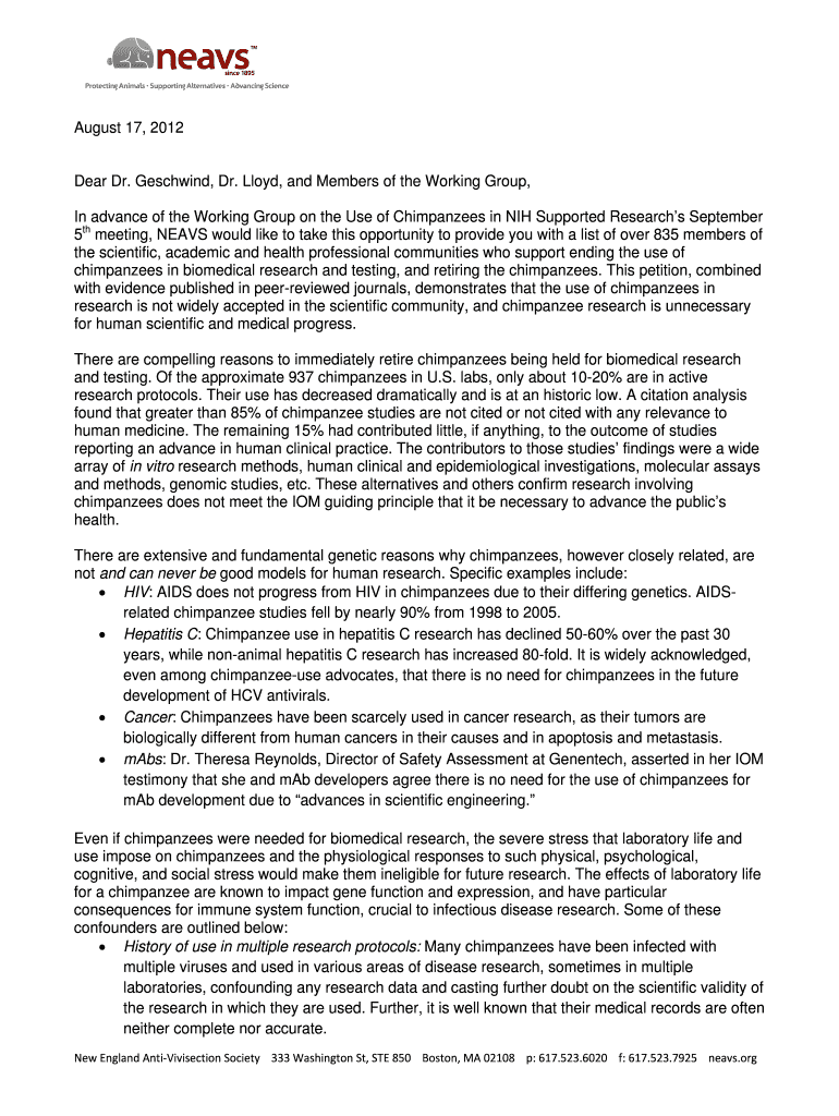 In advance of the Working Group on the Use of Chimpanzees in NIH Supported Research September