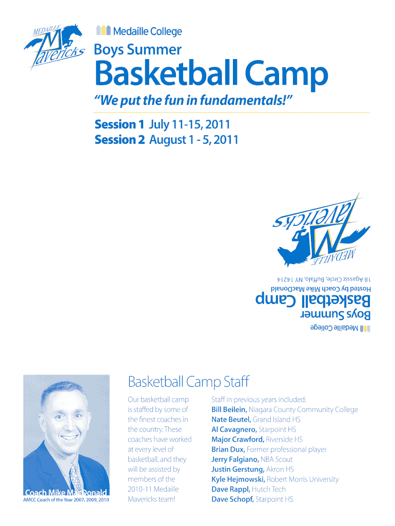 This document provides detailed information about the Boys Summer Basketball Camp hosted by Coach Mike MacDonald, including session dates, location, cost, camp features, daily schedule, and application