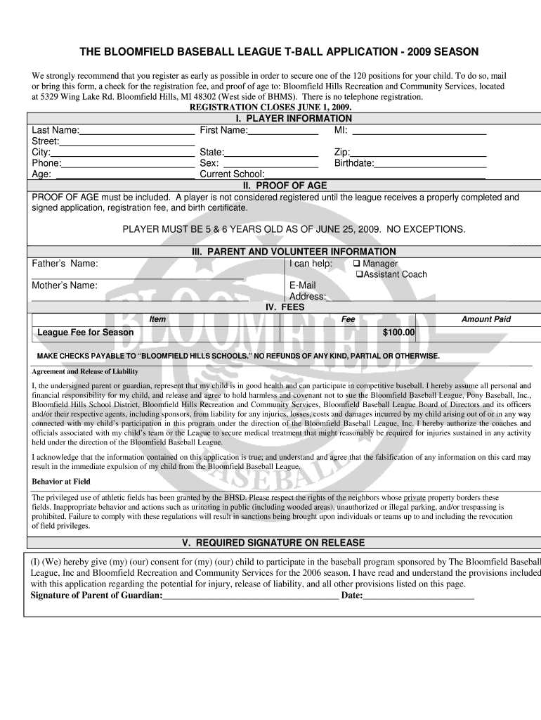 How to fill out bloomfield baseball league t-ball
