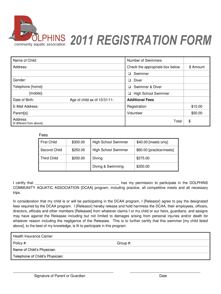 This document serves as a registration form for the DOLPHINS COMMUNITY AQUATIC ASSOCIATION program, detailing information required for registering a child as a swimmer or diver, along with associated