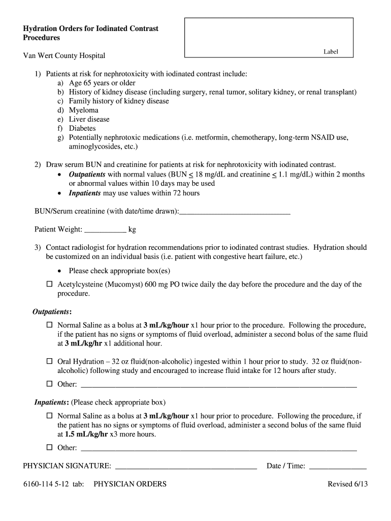 Hydration Orders for Dominated Contrast Procedures Label Van Were County Hospital 1) Patients at risk for nephrotoxicity with dominated contrast include: a) Age 65 years or older b) History of kidney