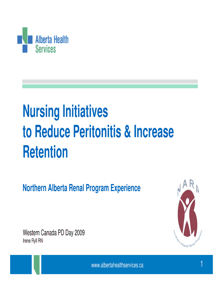 Nursing Initiatives to Reduce Peritonitis & Increase Retention Northern Alberta Renal Program Experience Western Canada PD Day 2009 Irene Roll RN www.albertahealthservices.ca 1 Peritoneal Dialysis
