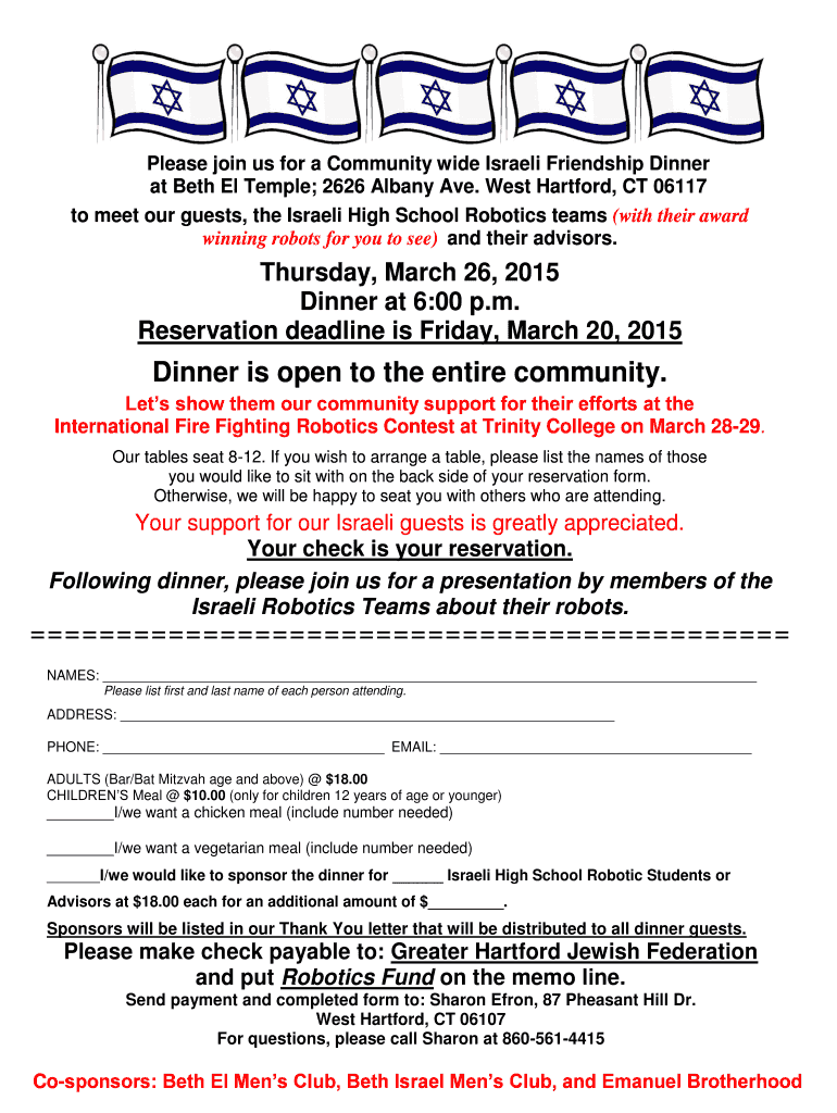 Please join us for a Community wide Israeli Friendship Dinner at Beth El Temple; 2626 Albany Ave. West Hartford, CT 06117 to meet our guests, the Israeli High School Robotics teams (with their award-winning