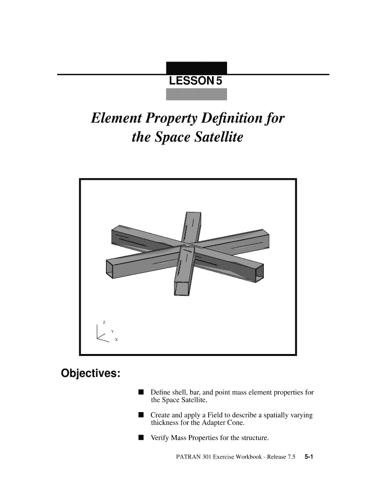 LESSON 5Element Property Definition for the Space Satellite Y Objectives: Define shell, bar, and point mass element properties for the Space Satellite. Create and apply a Field to describe a spatially