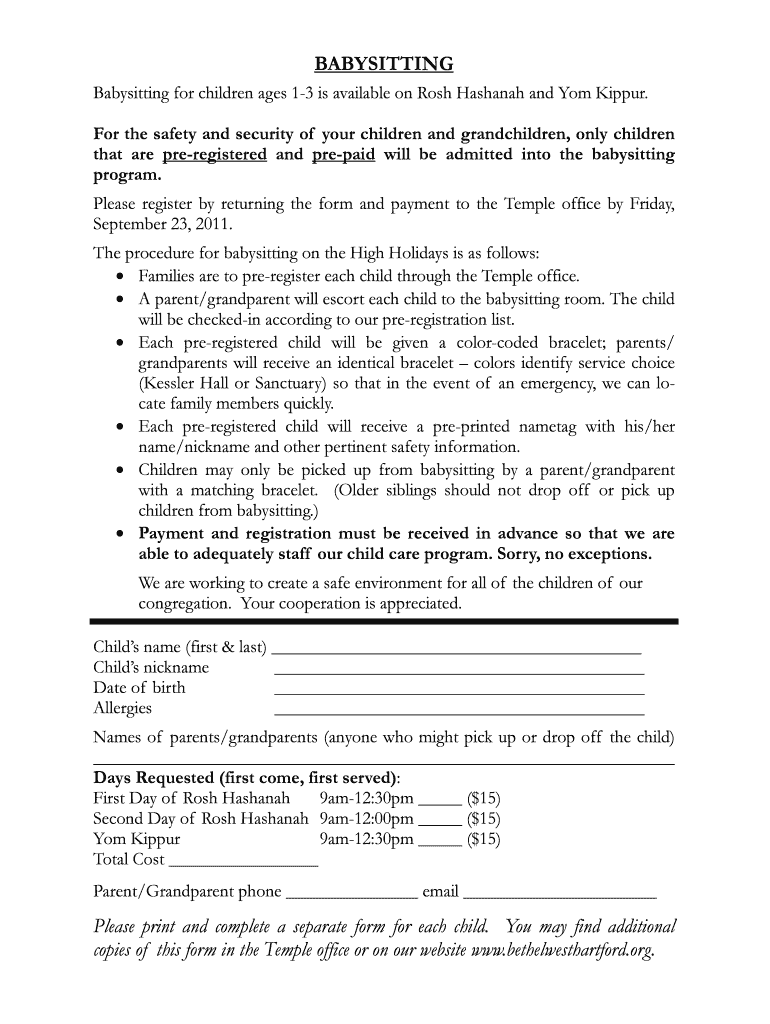 BABYSITTING for children ages 13 is available on Rosh Hashanah and Yom Kippur. For the safety and security of your children and grandchildren, only children that are preregistered and prepaid will