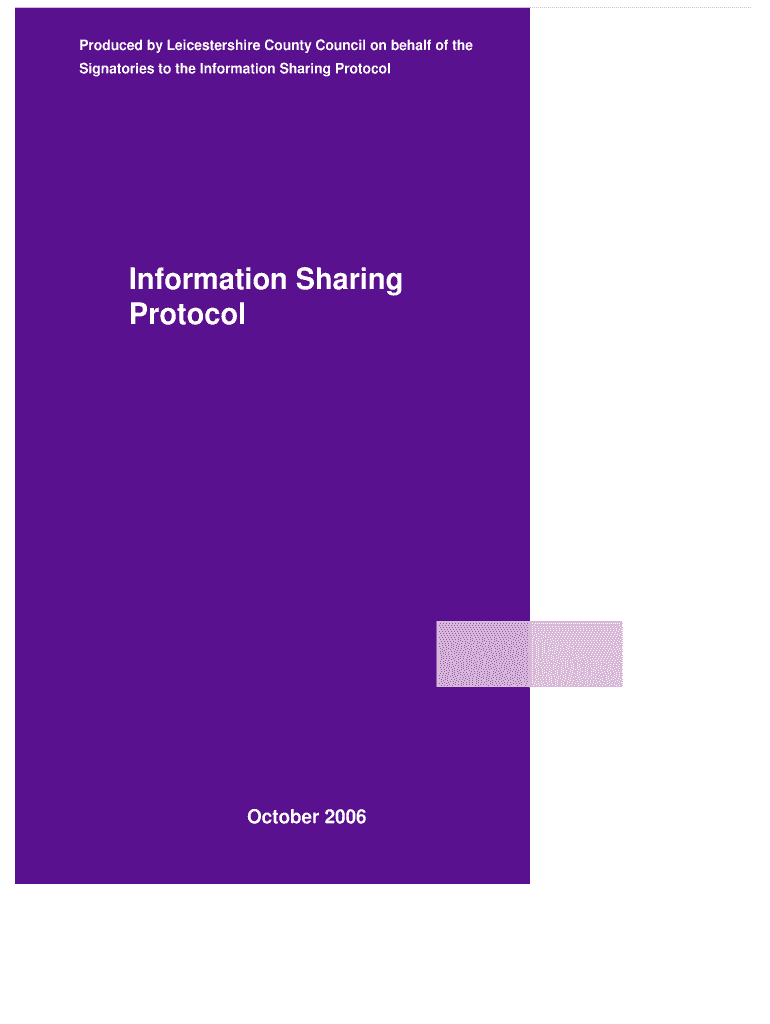 Produced by Leicestershire County Council on behalf of the Signatories to the Information Sharing Protocol Information Sharing Protocol October 2006 CONTENTS PREFACE 3 1. INTRODUCTION 4 2. SCOPE 5