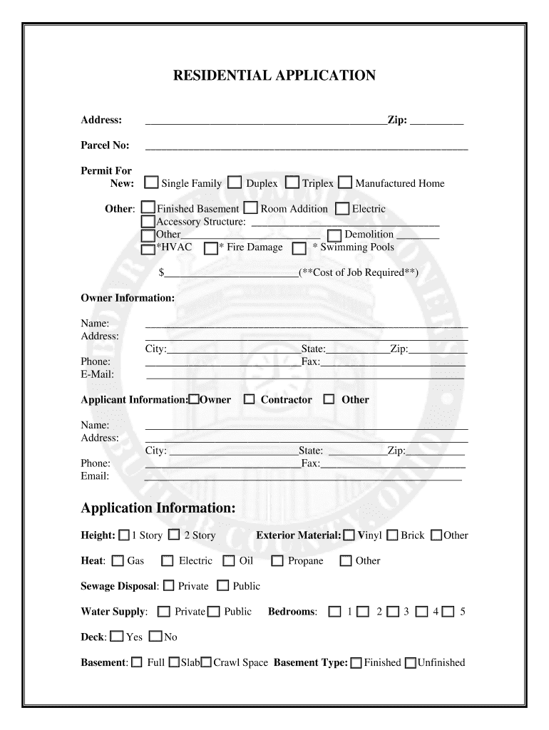 Reset Form Print RESIDENTIAL APPLICATION Address: Zip: Parcel No: Permit For New: Single Family Other: Duplex Triplex Manufactured Home Finished Basement Room Addition Electric Accessory Structure: