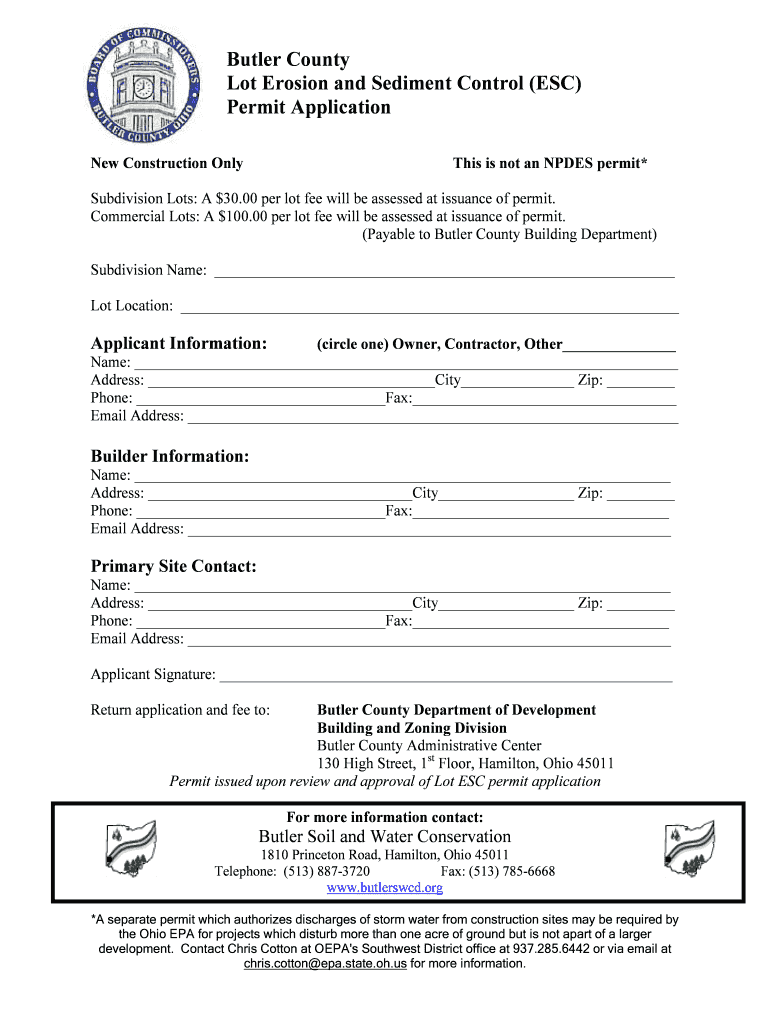 Butler County Lot Erosion and Sediment Control (ESC) Permit Application New Construction Only This is not an NODES permit* Subdivision Lots: A $30.00 per lot fee will be assessed at issuance of permit.