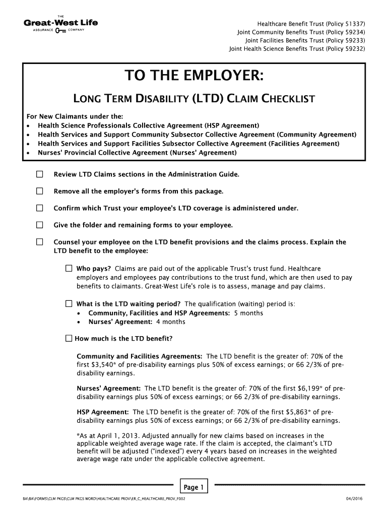 Healthcare Benefit Joint Community Benefits Joint Facilities Benefits Joint Health Science Benefits Trust (Policy (Policy (Policy (Policy 51337) 59234) 59233) 59232) TO THE EMPLOYER: LONG TERM DISABILITY