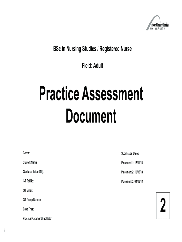 B.Sc. in Nursing Studies / Registered Nurse Field: Adult Practice Assessment Document Cohort: Submission Dates Student Name: Placement 1: 13/01/14 Guidance Tutor (GT): Placement 2: 12/05/14 GT Tel