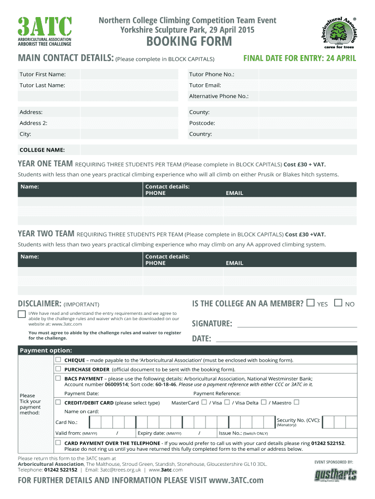 Northern College Climbing Competition Team Event Yorkshire Sculpture Park, 29 April 2015 BOOKING FORM MAIN CONTACT DETAILS: (Please complete in BLOCK CAPITALS) FINAL DATE FOR ENTRY: 24 APRIL Tutor