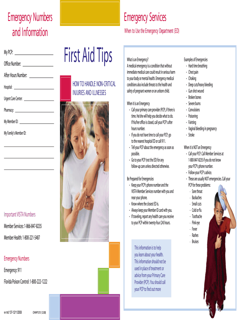 Emergency Numbers and Information My PCP: Office Number: Emergency Services When to Use the Emergency Department (ED) First Aid Tips After Hours Number: Hospital: Urgent Care Center: Pharmacy: My