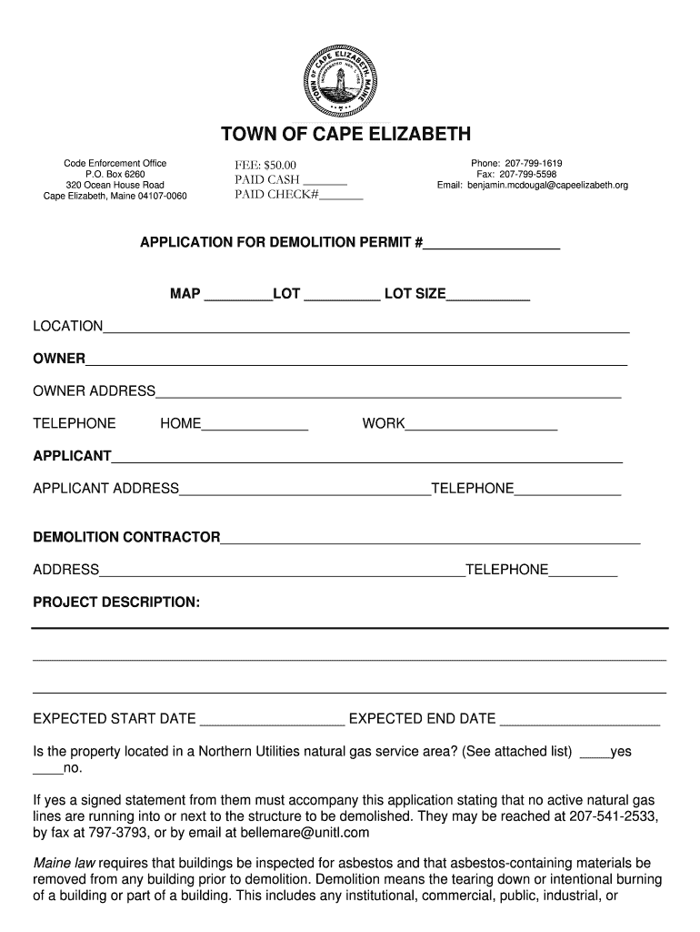 This document serves as an application form to request a permit for the demolition of a building, detailing necessary information about the owner, applicant, contractor, and asbestos inspection requirements.