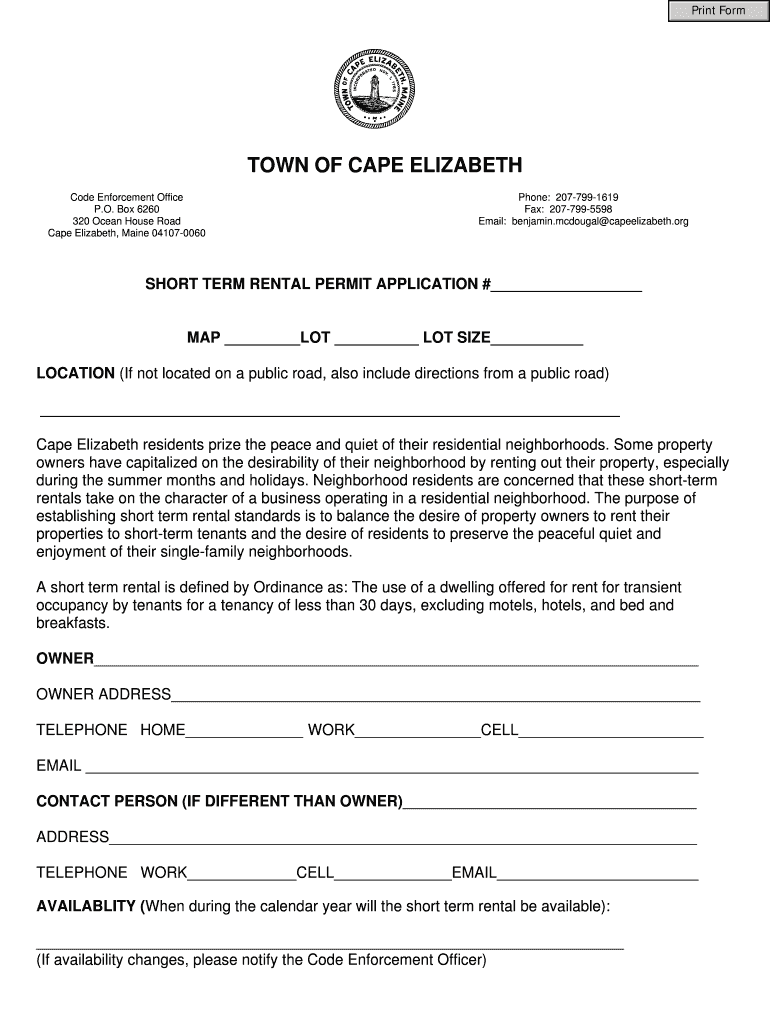 This document serves as an application for a short term rental permit in Cape Elizabeth, Maine, requiring various details from the property owner and compliance certification with local codes.