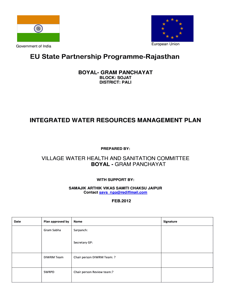 European Union Government of India EU State Partnership ProgrammeRajasthan ROYAL GRAM PENCHANT BLOCK: SEAT DISTRICT: PALE INTEGRATED WATER RESOURCES MANAGEMENT PLAN PREPARED BY: VILLAGE WATER HEALTH