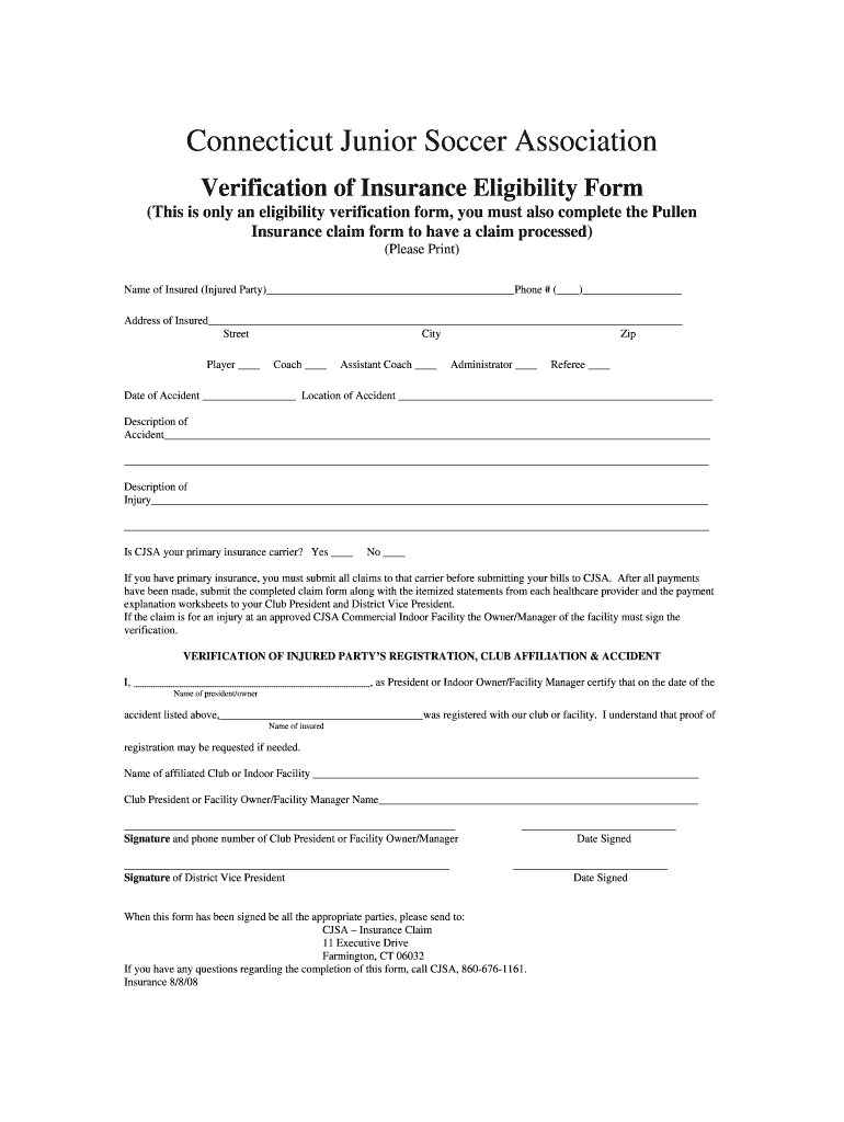 Connecticut Junior Soccer Association Verification of Insurance Eligibility Form (This is only an eligibility verification form, you must also complete the Pulled Insurance claim form to have a claim