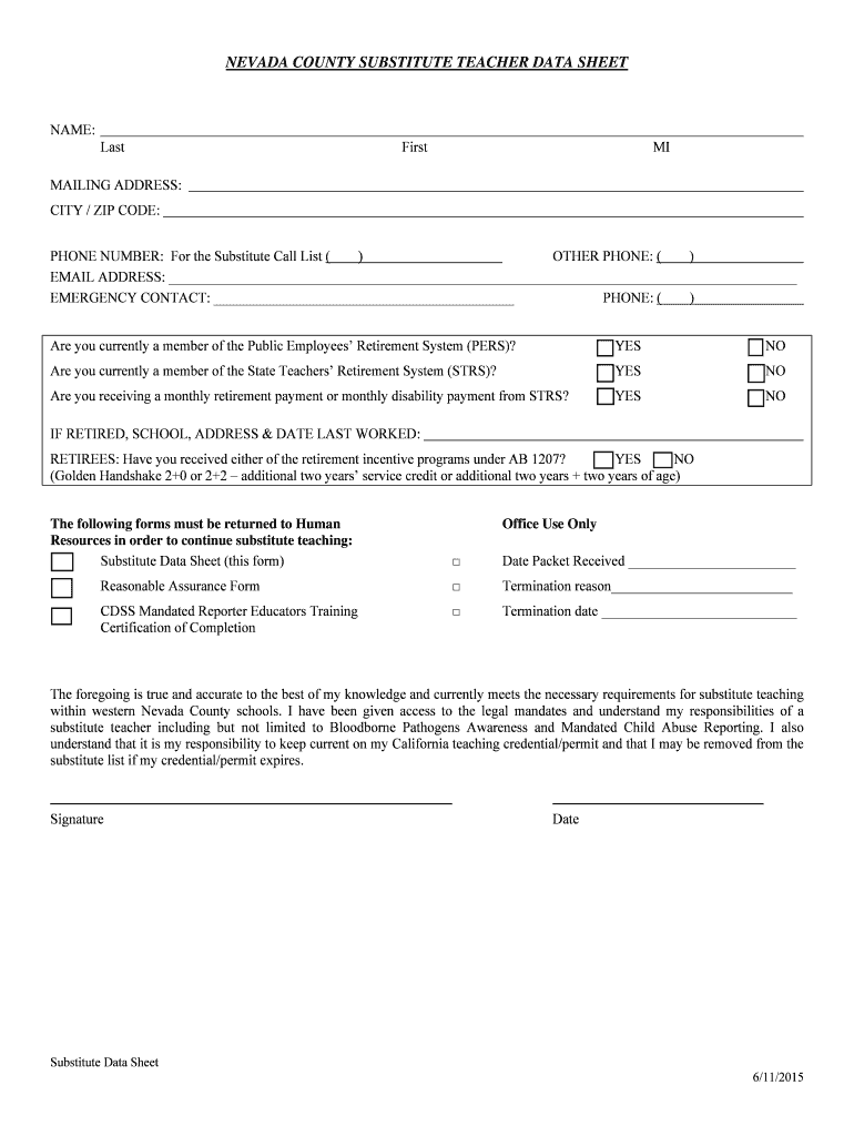 NEVADA COUNTY SUBSTITUTE TEACHER DATA SHEET NAME: Last First MI MAILING ADDRESS: CITY / ZIP CODE: PHONE NUMBER: For the Substitute Call List () OTHER PHONE: () EMAIL ADDRESS: EMERGENCY CONTACT: PHONE: