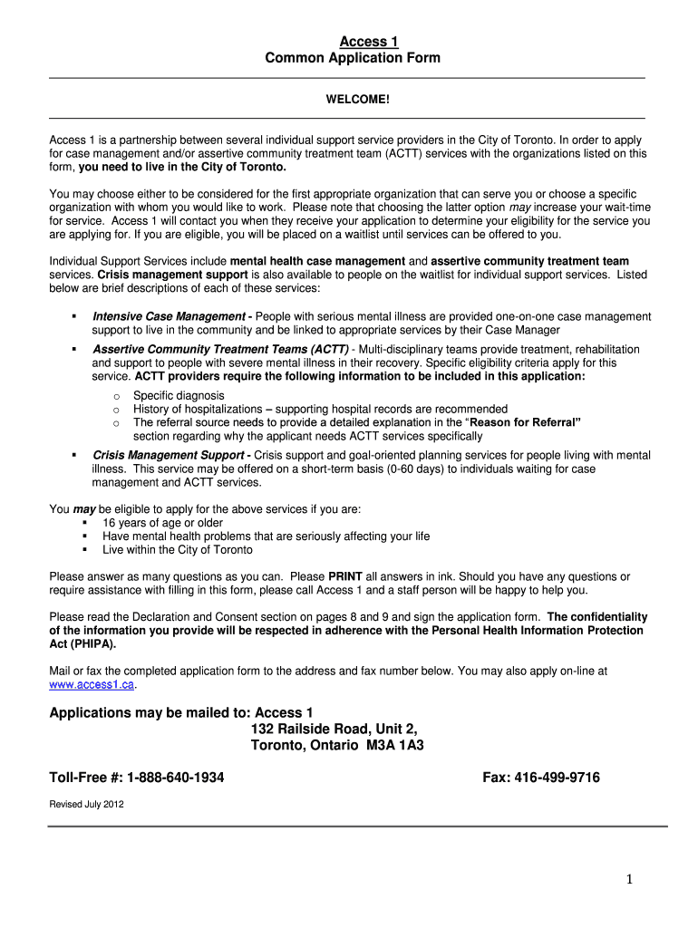 Access 1 Common Application Form WELCOME! Access 1 is a partnership between several individual support service providers in the City of Toronto. In order to apply for case management and/or assertive