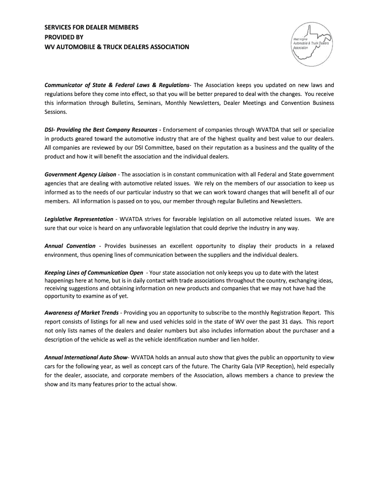 Get the free SERVICES FOR DEALER MEMBERS PROVIDED BY WV AUTOMOBILE