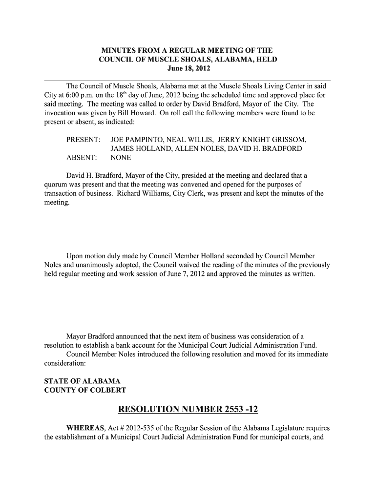 MINUTES FROM A REGULAR MEETING OF THE COUNCIL OF MUSCLE SHOALS, ALABAMA, HELD June 18, 2012, The Council of Muscle Shoals, Alabama met at the Muscle Shoals Living Center in said City at 6:00 p.m.