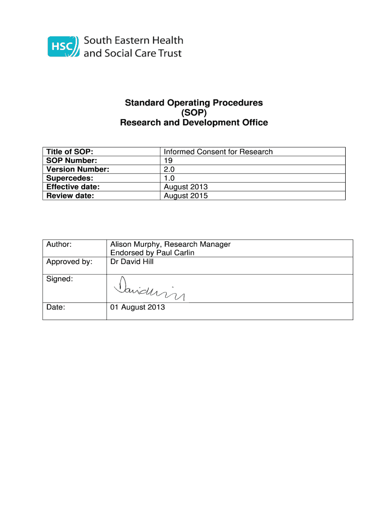 Standard Operating Procedures (SOP) Research and Development Office Title of SOP: SOP Number: Version Number: Supersedes: Effective date: Review date: Author: Approved by: Informed Consent for Research