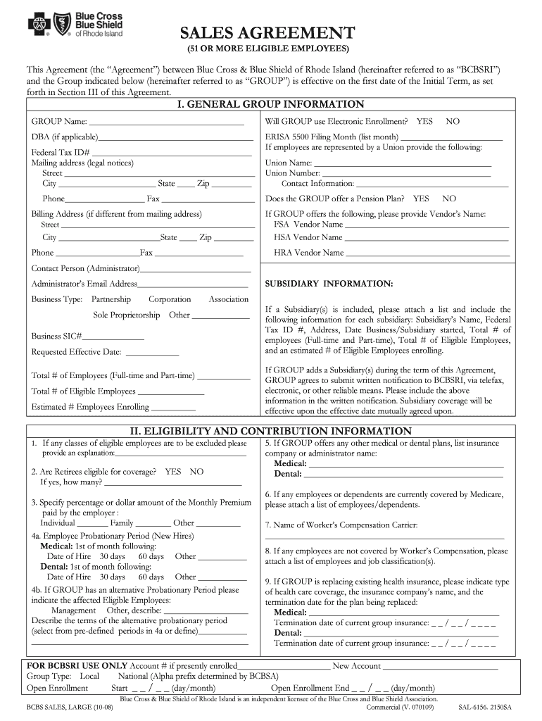 SALES AGREEMENT (51 OR MORE ELIGIBLE EMPLOYEES) This Agreement (the Agreement) between Blue Cross & Blue Shield of Rhode Island (hereinafter referred to as BCB SRI) and the Group indicated below (hereinafter