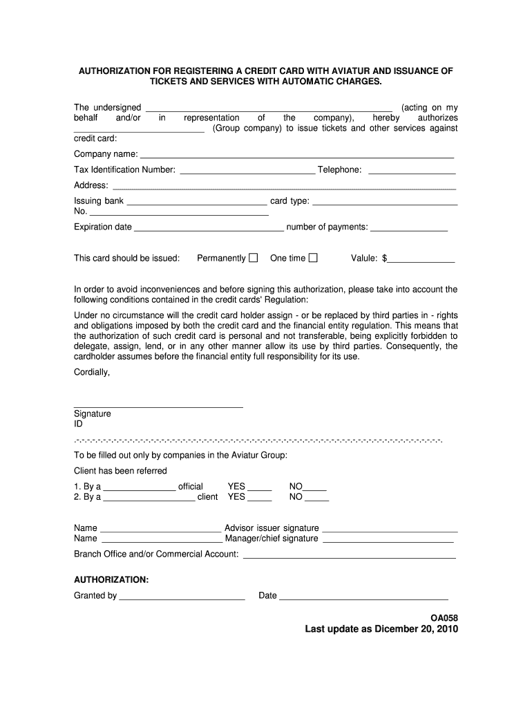 AUTHORIZATION FOR REGISTERING A CREDIT CARD WITH AVIATOR AND ISSUANCE OF TICKETS AND SERVICES WITH AUTOMATIC CHARGES. The undersigned (acting on my behalf and/or in representation of the company),