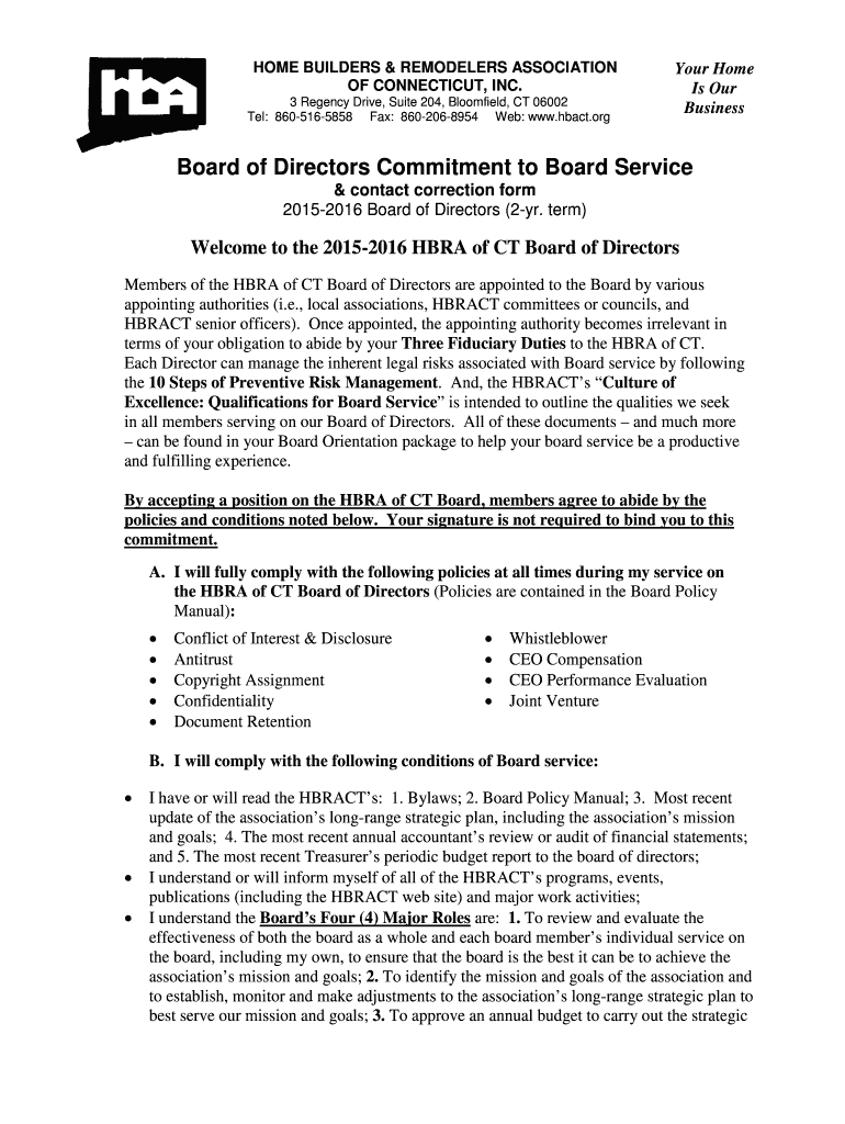 HOME BUILDERS & REMODEL ERS ASSOCIATION OF CONNECTICUT, INC. 3 Regency Drive, Suite 204, Bloomfield, CT 06002 Tel: 8605165858 Fax: 8602068954 Web: www.hbact.org Your Home Is Our Business Board of