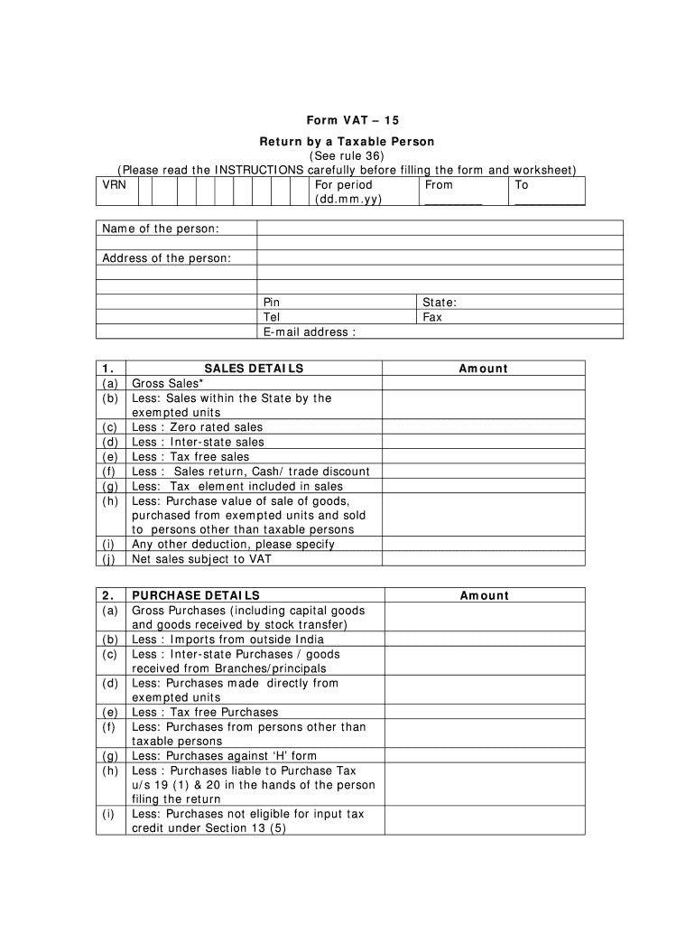 The Form VAT-15 is a tax return utilized by taxable persons in Punjab, India, designed to report essential financial details related to sales and purchases. This form holds significant importance for tax compliance, ensuring that taxable entities accurately declare their revenue and fulfill their tax obligations. The main components of the form include sections for sales details, purchase details, output tax, input tax credit, and tax payment details.