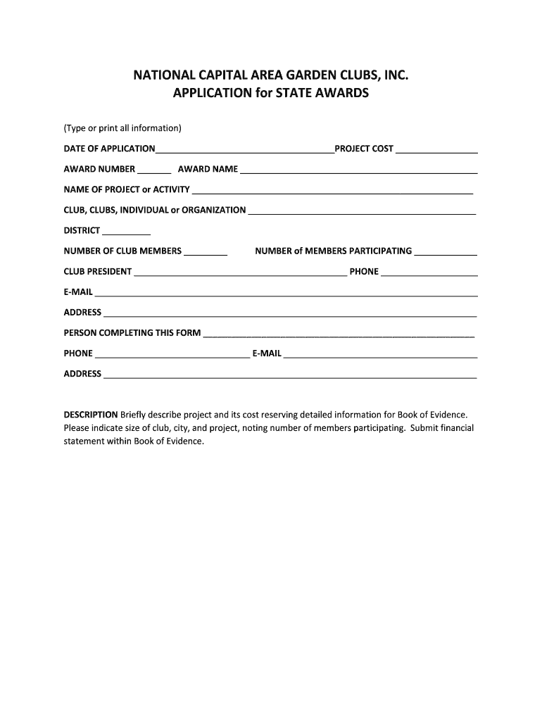 NATIONAL CAPITAL AREA GARDEN CLUBS, INC. APPLICATION for STATE AWARDS (Type or print all information) DATE OF APPLICATION ...